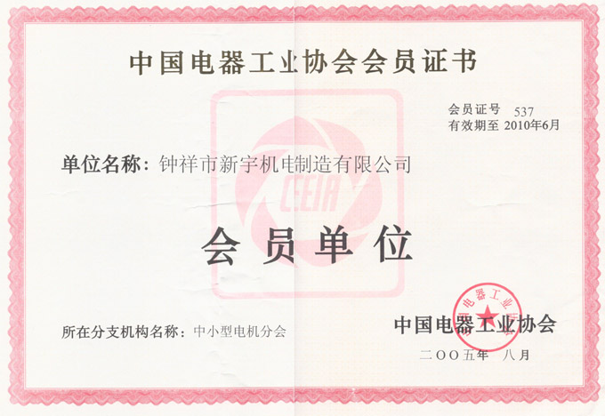 中國電器工業協會會員證書